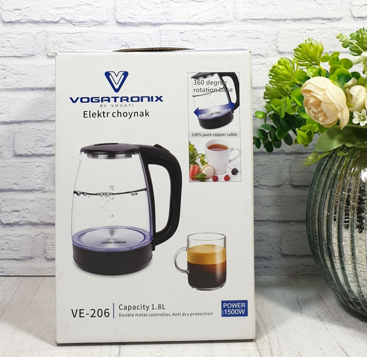 کتری برقی وگاتی VE-206 با مصرف بهینه شده با ظرفیت 1.8 لیتر یک دستگاه مناسب برای مصارف خانگی است.طراحی دستگاه به صورت بی سیم است و کتری را می توان با هر زاویه ای (0 تا 360 درجه) روی پایه مخصوص قرار داد. کتری برقی وگاتیVOGATI مجهز به سیستم خاموشی خودکار است، دکمه روشن و خاموش کتری روی دسته تعبیه شده که پس از روشن کردن و جوش آمدن آب درون کتری بطور خودکار خاموش می شود.جنس بدنه کتری از شیشه پیرکس ساخته شده است. سیستم قطع خودکار در صورت تمام شدن آب کتری از دیگر مزایای ایمنی کتری برقی وگاتی محسوب میشود. همچنین محل قرارگیری المنت گرم کننده به صورت مخفی و در کف کتری طراحی شده و به هیچ عنوان با آب در تماس نیست.