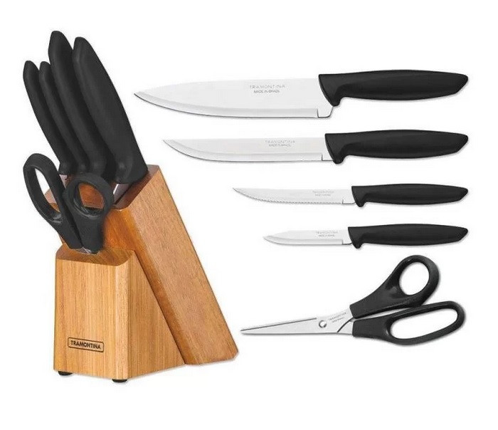سرویس چاقو ترامونتینا Tramontina دارای 4عدد چاقو مختلف برای استفاده در آشپزخانه میباشد به همراه این چاقو ها یک پایه چوبی هست که برای نگهداری آن ها به کار می رود. این پایه علاوه بر طراحی زیبا وظایف مهم دیگری بر عهده دارد. روی این پایه تعدادی شکاف برای قرار دادن چاقو ها تعبیه شده است. این باعث میشود تیغه چاقو ها با چیزی در تماس نباشند و مدت زمان بیشتری تیز خواهند ماند. همچنین منظم بودن و در دسترس بودن چاقو ها را اساتنر میکند.