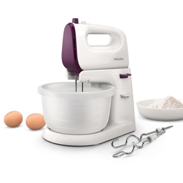 همزن کاسه دار فیلیپس مدل HR3745 از موتوری با قدرت 450 وات بهره می برد و با چرخش اتوماتیکی که کاسه دارد، امکان تهیه خمیر نان، کیک، بستنی، همزدن بهتر و کامل تر تخم مرغ و … فراهم می سازد. ناگفته نماند، می توان در صورت نیاز این دستگاه را به صورت دستی استفاده کرد.