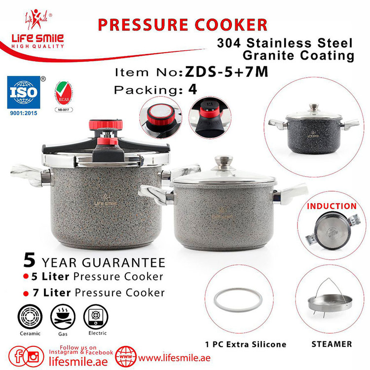 جنس بدنه دیگها از استیل ضد زنگ ۱۸/۱۰ کروم و نیکل است که بسیار مقاوم بوده و رسانای خوبی برای گرما هستند. پوشش بیرونی زودپز دوقلو لایف اسمایل مدل ZDS 5 7M ظرفیت ۵ و ۷ لیتر گرانیتی است که در مقابل هر گونه خط و خش مقاوم بوده و همچنین شستشوی دیگها را راحت خواهد کرد.